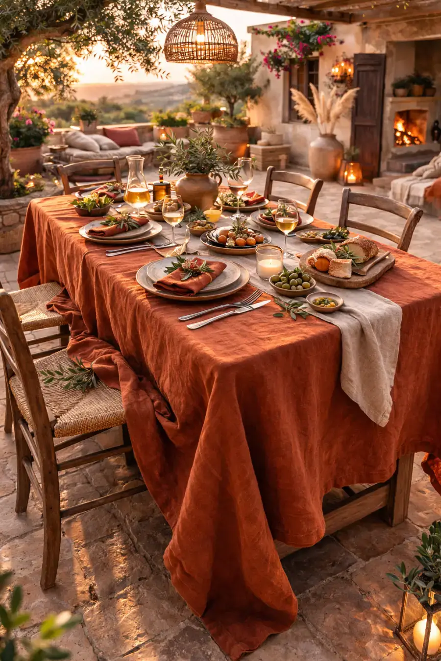 Dit linnen tafelkleed in terracotta brengt warmte en rust aan elke setting. De diepe aardetint doet denken aan zonverwarmde pleinen in Zuid-Spanje en mediterrane diners onder een zachte avondlucht.