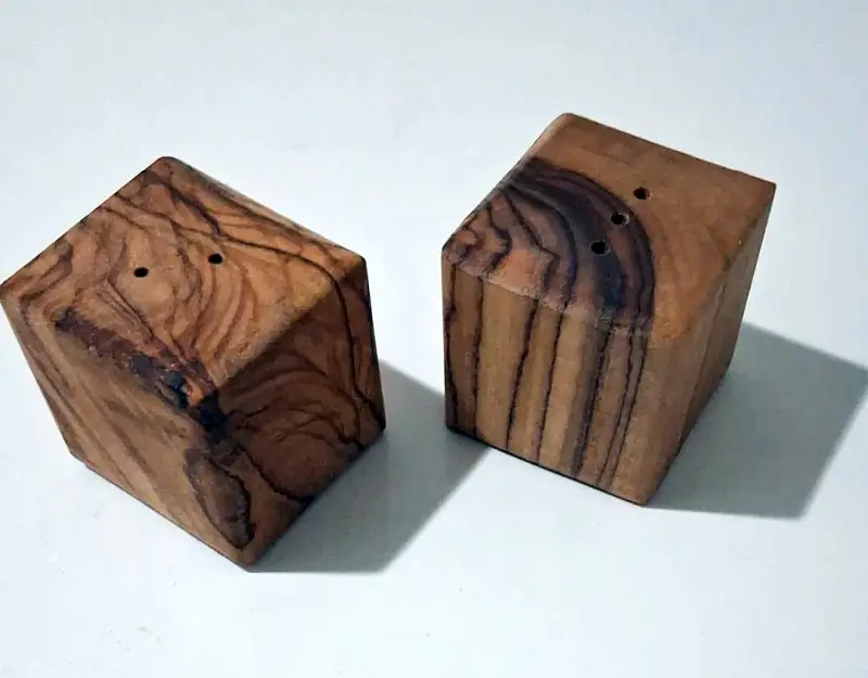 Deze handgemaakte olijfhouten peper- en zoutset wordt geleverd in een naturel linnen zakje met Olé & Co.-label. De set is gemaakt van Europees olijfhout en heeft een compact formaat van 4 × 4 cm per stuk.